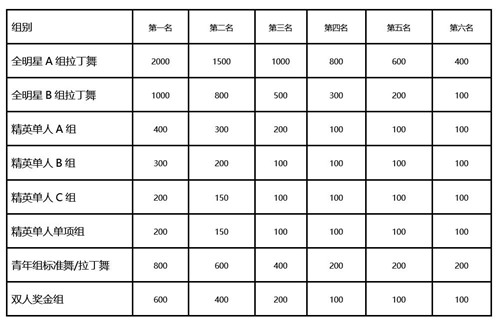 1、精英各组奖金各组,录取前6名,均发奖金、奖杯(单)、奖牌及证书。如果以下各双人组报名人数分别少于6对多于3对或单人组报名少于6人多于3人,奖金减半;如该组报名少于3对(含3对)或3人(含3人)(单人组),将取消该组比赛或并组比赛,该组奖金取消。。(奖金组颁发以人民币元为计算单位)